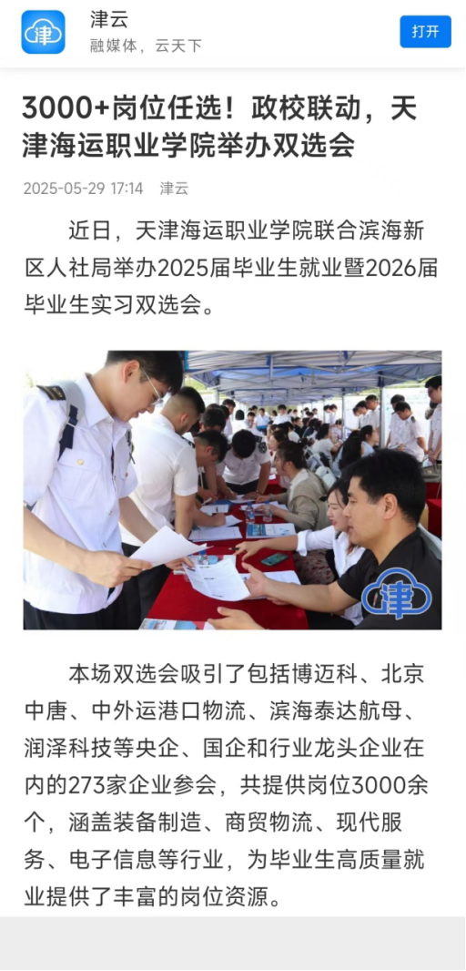 5月29日,津云客戶端發(fā)表文章《3000+崗位任選!政校聯(lián)動,天津海運職業(yè)學院舉辦雙選會》,報道天津海運職業(yè)學院舉辦2025屆畢業(yè)生就業(yè)雙選會暨2026屆畢業(yè)生實習雙選會。