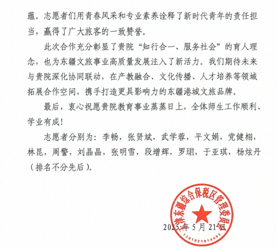 感謝信中寫到,志愿者用專業的能力、飽滿的熱情、周到的服務點亮天津大學生的青春底色,為提升區域文旅服務品質、展現東疆國際港城形象作出了突出貢獻。這份認可,亦是學院堅持立德樹人、引導學生服務社會、在實踐中歷練成長育人成果的有力印證。青春腳步丈量服務熱土,志愿微光匯聚城市溫度——海運學子正以實際行動書寫新時代青年的擔當答卷。