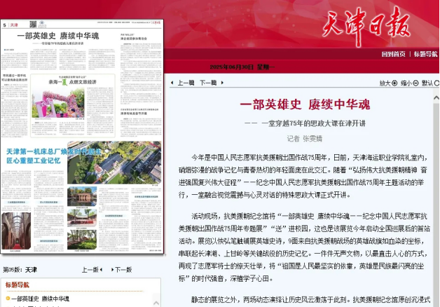 6月30日,《天津日報》刊發(fā)文章《一部英雄史 賡續(xù)中華魂—— 一堂穿越75年的思政大課在津開講》,報道天津海運職業(yè)學(xué)院組織開展“弘揚偉大抗美援朝精神奮進強國復(fù)興偉大征程”——紀念中國人民志愿軍抗美援朝出國作戰(zhàn)75周年主題活動。