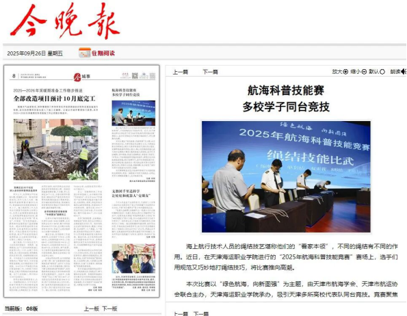9月26日,《今晚報》刊發(fā)文章《航海科普技能賽 多校學(xué)子同臺競技》,報道2025年航海科普技能競賽在天津海運(yùn)職業(yè)學(xué)院圓滿舉辦。本次競賽由天津市航海學(xué)會、天津市航運(yùn)協(xié)會聯(lián)合主辦,天津海運(yùn)職業(yè)學(xué)院承辦,吸引了來自天津各高校的六支代表隊(duì)同臺競技。