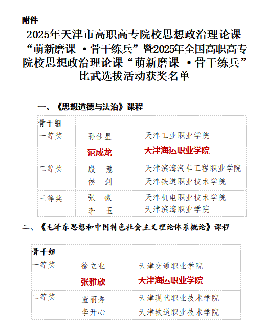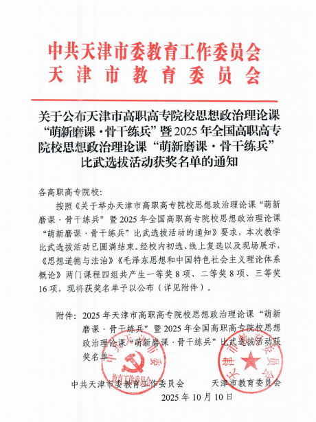 近日,市教育兩委公布了2025年天津市高職高專(zhuān)院校思想政治理論課“萌新磨課·骨干練兵”獲獎(jiǎng)名單,學(xué)院思政課教師范成龍、張雅欣在骨干練兵比賽中榮獲一等獎(jiǎng)。