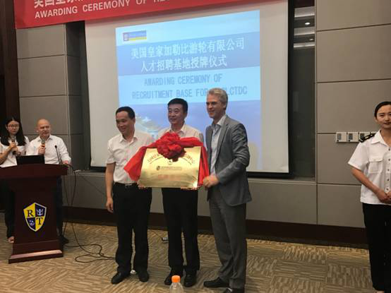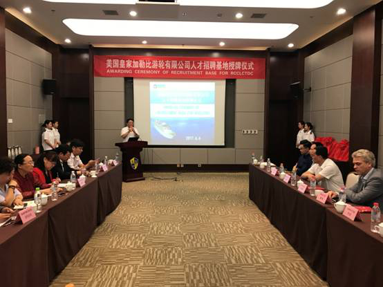 2017年 6月6日上午,美國皇家加勒比游輪有限公司人才招聘基地授牌儀式在天津海運職業學院海郵酒店絢麗廳舉行。授牌儀式由美國皇家加勒比游輪有限公司(簡稱RCCL)亞太地區人力資源總監Lawrence主持,全球人才管理副總裁Hernan、亞太地區組織發展與船員顧問Francois和我院黨委書記馬魁君、院長武寶林、國際交流處(培訓中心)處長耿春梅及五所招聘基地學校領導出席儀式。