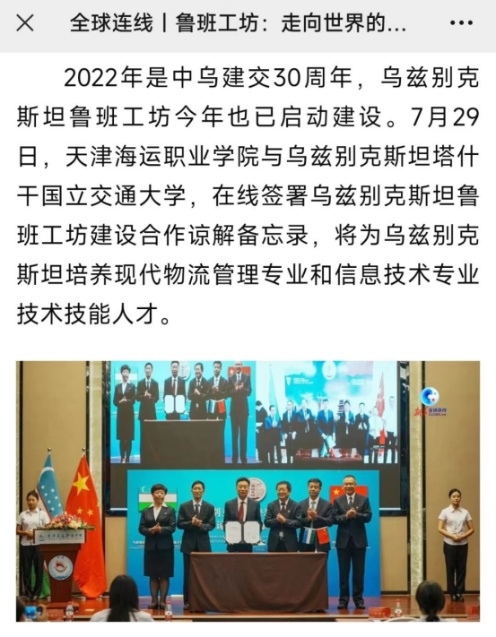 2022年9月15日、16日,新華社分別發表文章《魯班工坊:走向世界的中國職教名片》和《Construction of Luban Workshop accelerating in SCO countries》,介紹了天津海運職業學院與烏茲別克斯坦塔什干國立交通大學共建魯班工坊情況。