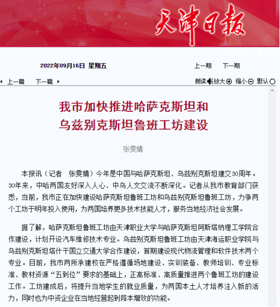 2022年9月16日,《天津日報》發表文章《我市加快推進哈薩克斯坦和烏茲別克斯坦魯班工坊建設》,報道了天津海運職業學院與烏茲別克斯坦塔什干國立交通大學共建魯班工坊建設情況。