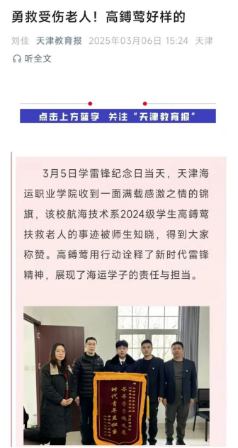 3月6日,天津教育報微信公眾號發表文章《勇救受傷老人!高鎛鶯好樣的》,報道了天津海運職業學院航海技術系2024級學生高鎛鶯扶救老人的事跡。緊急時刻顯擔當,勇敢救助受傷老人,高鎛鶯好樣的! 3月1日早上7點左右,高鎛鶯在中海月壇附近騎行,看到一位老奶奶摔倒在地,老人頭部受傷大量出血,考慮到老人的生命安全,雖然害怕,但高鎛鶯依然果斷下車,將老人扶到路邊,用口袋中的紙巾幫助老人處理傷口,迅速與老人的子女取得聯系,在看到老人被平安送往醫院后,高鎛鶯才默默離開。