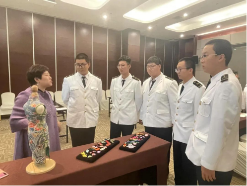在美育研習(xí)基地的教室里,學(xué)生們圍坐在一起,專注地聆聽非遺傳承人的講解。桌上擺放著各色布料、針線和工具,手工盤扣的制作過程在傳承人手中變得靈動(dòng)起來(lái)。盤、縫、包、纏……每一個(gè)步驟都蘊(yùn)含著精湛的技藝與匠心。國(guó)際郵輪乘務(wù)管理專業(yè)學(xué)生張明雪經(jīng)過一個(gè)學(xué)期的學(xué)習(xí),已經(jīng)能夠熟練地制作出精美的盤扣。“每一個(gè)盤扣都像是一件微小而精致的藝術(shù)品,蘊(yùn)含著中華優(yōu)秀傳統(tǒng)文化的深厚內(nèi)涵。”結(jié)合所學(xué)專業(yè),她對(duì)盤扣技藝多了自己的理解,“郵輪是連接世界的移動(dòng)平臺(tái),來(lái)自不同國(guó)家和地區(qū)的人們匯聚于此。我可以將所學(xué)的盤扣技藝展示給世界各地的游客,讓他們了解中國(guó)非遺文化的魅力。小小的盤扣可以搭建起中外文化交流的橋梁。這不僅能豐富游客的旅行體驗(yàn),也能增強(qiáng)我作為文化傳播者的使命感和責(zé)任感,讓我在郵輪工作中實(shí)現(xiàn)更大的價(jià)值。”