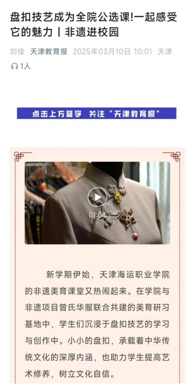 3月10日,天津教育報(bào)微信公眾號(hào)發(fā)布文章《盤扣技藝成為全院公選課!一起感受它的魅力|非遺進(jìn)校園》,報(bào)道天津海運(yùn)職業(yè)學(xué)院開設(shè)全院公選課《曾氏津派盤扣技藝實(shí)踐》,使盤扣這項(xiàng)歷史悠久、技藝精湛又兼具深厚文化內(nèi)涵的非遺技能走進(jìn)校園,在美育課堂上扎根發(fā)芽,吸引廣大學(xué)子沉浸式感受非遺魅力。