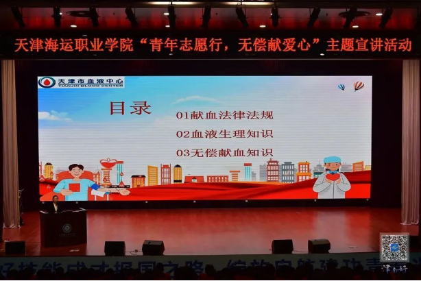 近日,天津海運職業學院舉辦"青春志愿行,無償獻愛心"主題宣講活動。本次活動由學院團委與天津市血液中心聯合主辦,學院各級團組織負責人、全體輔導員及600余名學生代表參加活動。