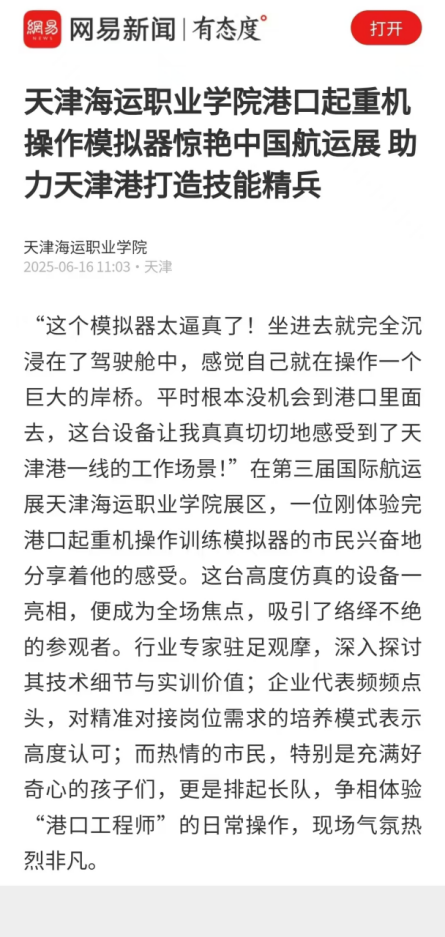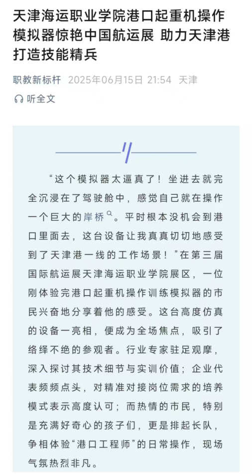 第三屆國際航運展期間,天津海運職業學院展區展出的港口起吊機訓練模擬器驚艷亮相,成為全場焦點,吸引了絡繹不絕的參觀者。人民網、央視新聞、天津教育報、職教新標桿等媒體平臺對此進行了關注報道。