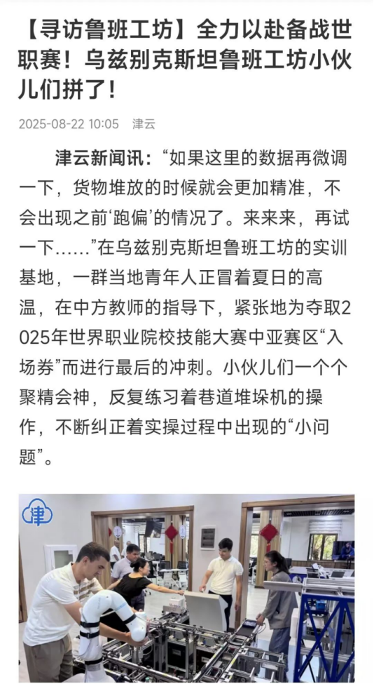 8月22日,津云發(fā)表文章《【尋訪魯班工坊】全力以赴備戰(zhàn)世職賽!烏茲別克斯坦魯班工坊小伙兒們拼了!》,報(bào)道烏茲別克斯坦魯班工坊及積極備戰(zhàn)2025年世界職業(yè)院校技能大賽中亞賽區(qū)(烏茲別克斯坦)的魯班工坊學(xué)員。