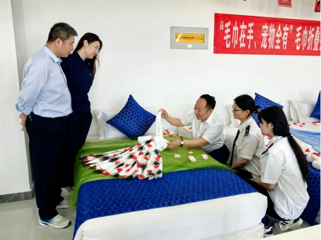 “為游客準備精美的毛巾寵物是郵輪客艙服務的國際慣例,這絕非簡單的服務技能,而是一門獨特的藝術創(chuàng)作”,中國酒店服務大師、中國金鑰匙天津地區(qū)秘書長、郵輪旅游系酒店管理專業(yè)帶頭人胡順利老師介紹道,“每一件作品都經過了精心設計,不僅要確保結構的穩(wěn)定性,更要精準地呈現動物的神態(tài)特征。學生們在沉浸式創(chuàng)作實踐中,不但可以鍛煉空間想象力與動手能力,還能夠培養(yǎng)對自然美學的感知能力。”通過這種方式,勞動教育、美育教育等也有機地融入技能訓練之中,實現了學生綜合素養(yǎng)和技能水準的全面提升。
