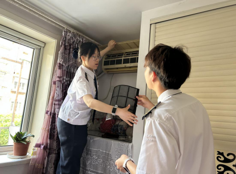 宣講完畢后,志愿者們分兩組開展“空調(diào)煥新”服務(wù)。制冷專業(yè)學(xué)生運用課堂所學(xué),細致拆洗空調(diào)濾網(wǎng)、消毒蒸發(fā)器;安全專業(yè)學(xué)生則同步排查電路隱患,向居民普及夏季防火知識。師生們不僅細致清理積塵、消毒濾網(wǎng),還現(xiàn)場檢測空調(diào)運行狀態(tài),針對常見問題提供維護建議?!斑@次實踐讓我掌握了空調(diào)清洗的標(biāo)準(zhǔn)化流程,比課本教學(xué)更直觀”,參與服務(wù)的學(xué)生表示。通過深入社區(qū)、深入群眾,貼心開展志愿服務(wù),收獲了社區(qū)居民的歡迎和贊譽。