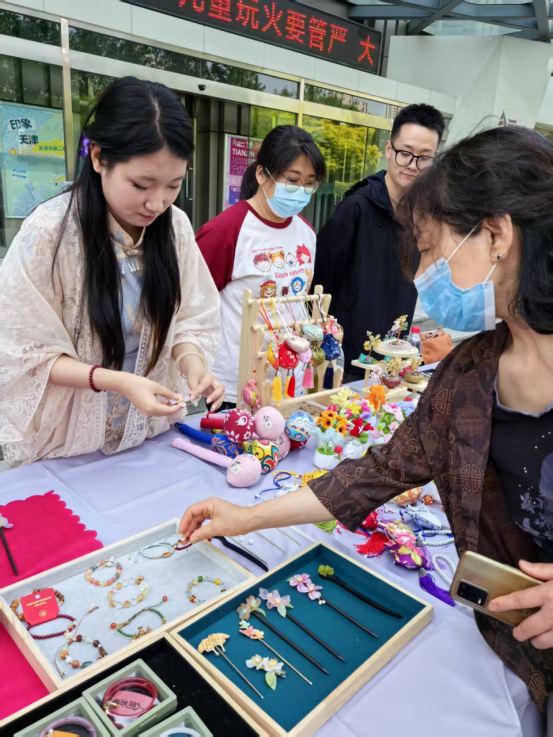 “中國旅游日”期間,應津南區文化和旅游局、天津市文化館邀請,基礎教學部(體育部)帶領數學文化社、熙華古服飾社團的學生,參加津南區“津彩南望?美好旅程”主題活動。學生們自發擔任文化講解員,向參觀人員普及非遺知識,成為一道亮麗的“文化風景線”。在2025年天津市文化館服務宣傳周活動上,我院學子帶來的個性展品展現了年輕一代的創意力量,吸引市民駐足體驗。