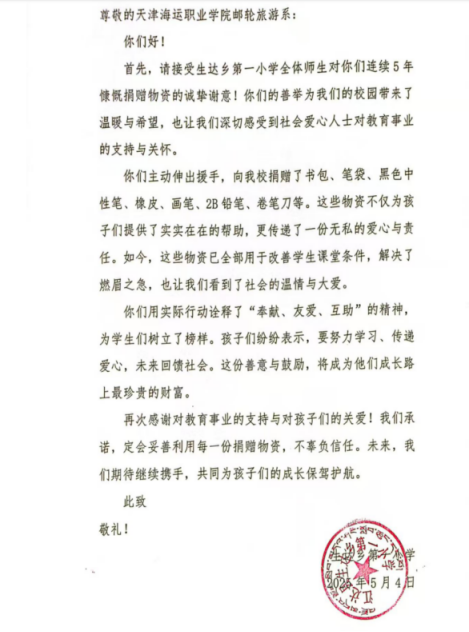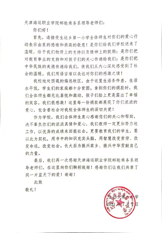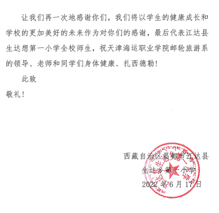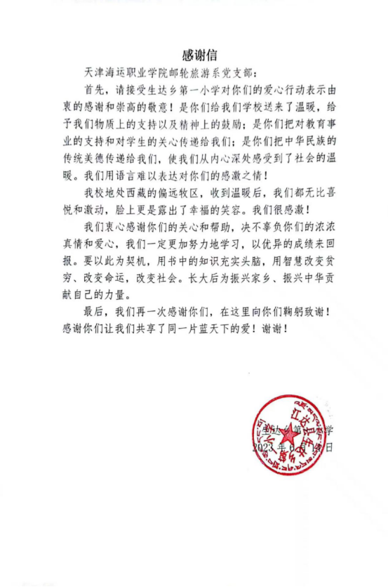 寒來暑往,五載春秋。一份源自郵輪旅游系全體師生的深情牽掛,跨越三千公里的壯闊山河,飛越四千米海拔的巍巍雪域,年復一年,精準抵達西藏昌都孩子們的手中。這,是郵輪旅游系師生心系高原教育、情牽藏族學子的動人篇章——我們連續五年,堅持不懈地為昌都地區生達鄉第一小學的學生捐贈書包、文具、書籍等文化學習用品,這些文具不僅解決了課堂教學的燃眉之急,更是激勵一批又一批西部孩子們的求學之心。孩子們說,他們會努力學習、傳遞愛心、回饋社會。
