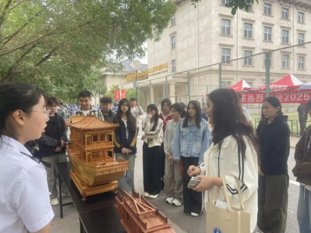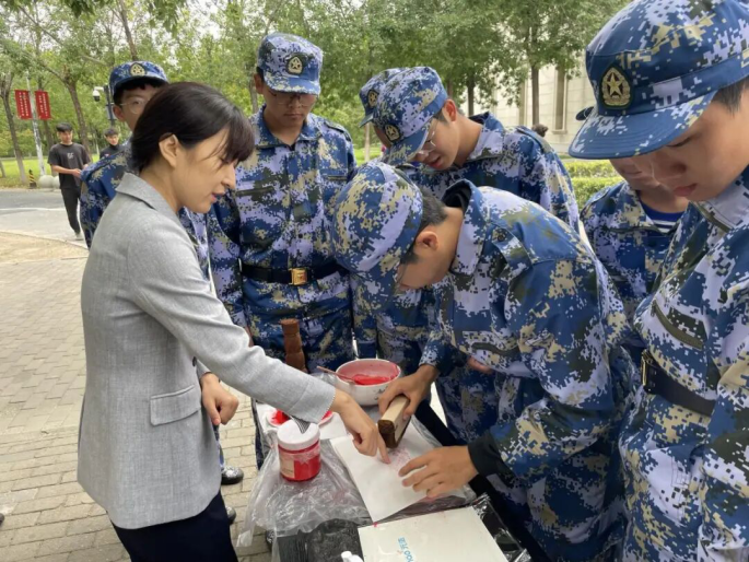 在非遺展示體驗區,楊柳青木版年畫、泥人張彩塑、田氏船模、無同竹編、溫派面塑、于氏掐絲琺瑯釉彩畫、寧氏漆藝鑲嵌漆器、麥秸畫、模具彩塑、傳統刻瓷等展位瞬間被大一新生們“包圍”。非遺傳承人現場展示非遺技藝,講解項目傳承歷史,為學生們獻上獨特的美育“開學第一課”?;顒蝇F場,同學們打卡非遺市集,近距離感受中華優秀傳統文化的獨特魅力。非遺美育的沉浸體驗與“五育融合”的迷彩軍營相向而行,讓青年學子在美美與共中厚植文化自信。學院留學生、聯合培養和田班學生也被吸引而來,紛紛感嘆優秀傳統文化的博大精深。