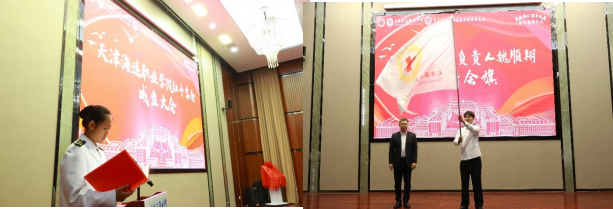 學院紅十字會學生負責人姚佳宜代表全體志愿者發言,表達了踐行紅十字精神的堅定決心。學院團委書記王洋、后勤與基建管理處副處長劉曉陽共同為“天津海運職業學院紅十字會”揭牌。在全體與會人員的見證下,劉曉陽副處長將象征著責任與使命的紅十字會會旗鄭重授予學生負責人魏順翔,標志著學院紅十字會工作的全面啟動。