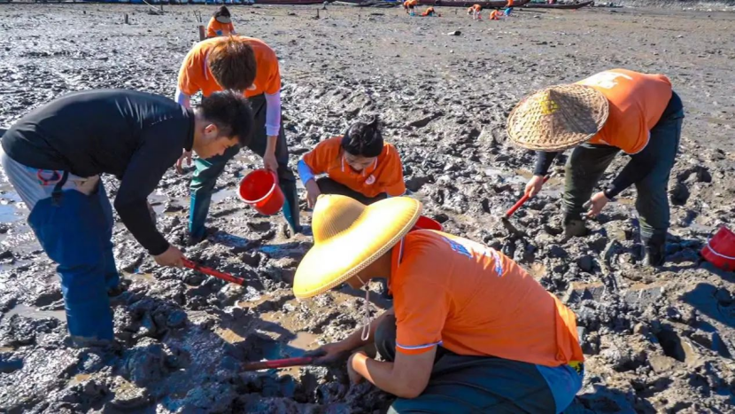 為深入貫徹黨的教育方針,全面加強新時代勞動教育,充分發揮勞動育人功能,實踐團來到牛嶼灘涂趕海研學實踐基地。通過與實踐基地負責人郜老師深入交流,同學們了解到這片海域為貝類提供了棲息和繁衍的場所,從而成為了霞浦獨特的趕海地,趕海在很早之前就成為了當地一種重要的生計方式,并一代代地傳承下來。同學們挽起褲腿、拿著工具扎進灘涂中體驗當地的趕海生活。為響應保護海洋生態環境的號召,在趕海的同時團隊成員們都積極撿拾垃圾,減輕垃圾對生態環境和漁民工作造成的影響。