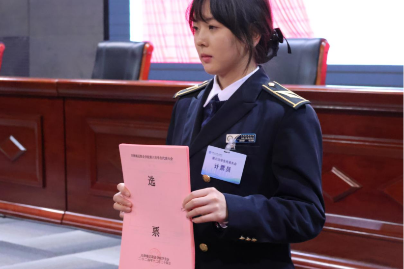 大會期間,對《天津海運職業學院學生會章程》書面報告進行了嚴謹審議,確保章程與時俱進、貼合學院發展需求與學生權益保障。選舉大會嚴格遵循“公平、公正、公開”原則有序推進,通過無記名投票的規范程序,歷經預選舉的初步篩選、等額選舉的精準確定以及差額投票的民主抉擇等環節,成功選舉產生 9 名常務委員會成員與 5 名第六屆主席團成員,為學生會組織注入新鮮血液,構建起充滿活力與創新力的新一屆領導團隊。