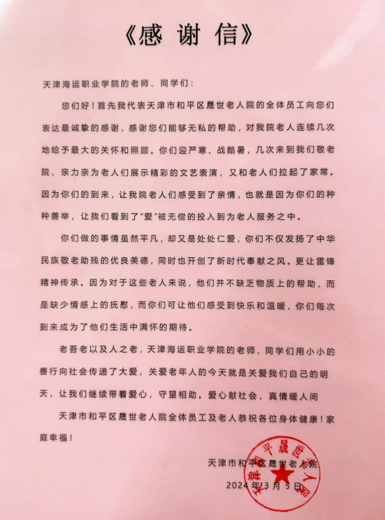 通過此次活動,讓老人們既切實感受到來自社會的體貼與溫暖,又弘揚傳播了雷鋒精神。晟世老人院也為此寫下了“感謝信”,回饋并感謝我院全體師生在每次志愿服務當中付出的努力與堅持。未來,黨委學生工作部(學生處)、共青團天津海運職業學院委員會將采用多種形式持續推進助老愛老活動,不斷提升老年人的生活品質和幸福指數,讓雷鋒精神,在新時代閃閃發光。