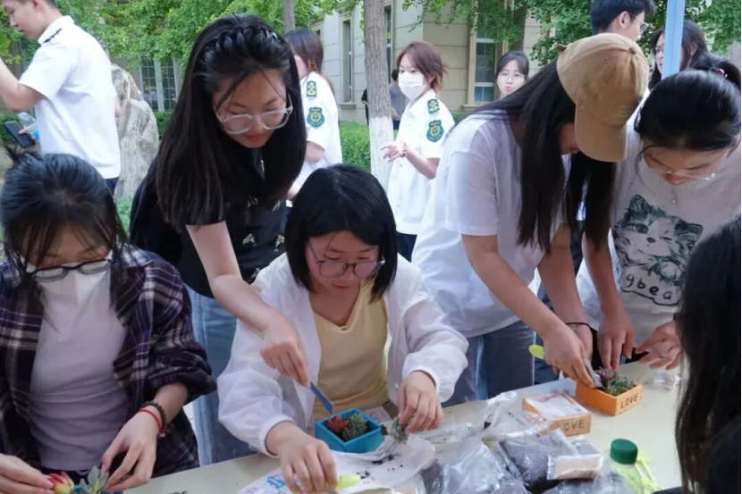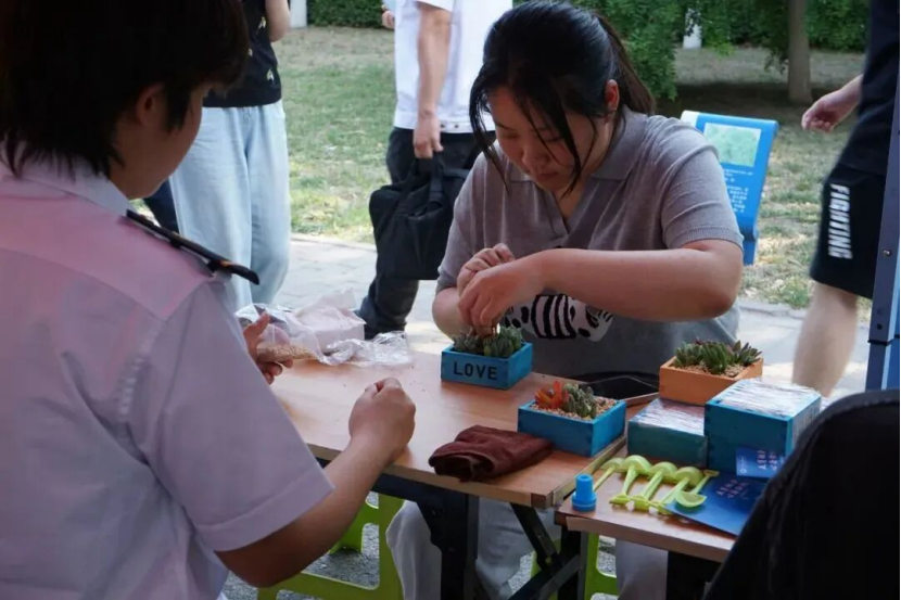 在“綠動心舍”DIY多肉微景觀活動中,學(xué)生親手種植植物,感受自然療愈力。學(xué)生紛紛表示,要將把作品帶回宿舍,在持續(xù)照料中體會“以勞健心”的深層意義。