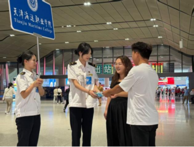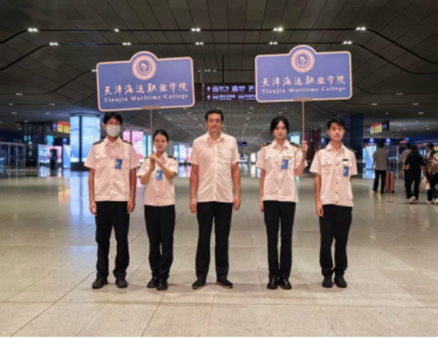 早上六點,院團委的學生志愿者們出發前往天津西站、天津站等人流密集的站點。他們手持“天津海運職業學院”歡迎牌,以笑容和周到的服務,為新生指引方向。
