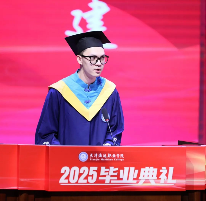 天津市大學(xué)生年度人物提名獎獲得者、工程技術(shù)系理化測試與質(zhì)檢技術(shù)(無損檢測技術(shù))專業(yè)學(xué)生王銘鑫,郵輪旅游系旅游管理專業(yè)烏茲別克斯坦籍留學(xué)生王馬克西姆晉平分別代表2025屆畢業(yè)生、2025屆留學(xué)生發(fā)言,他們細數(shù)了三年求學(xué)的難忘時刻,表達了對母校及老師的依依不舍和由衷謝意。尤其是王馬克西姆晉平同學(xué)娓娓道來的“中國緣”“海運情”,以真實而生動的故事展示了學(xué)院國際化辦學(xué)成效,讓我們看到了“人類命運共同體”閃亮的青春注腳。